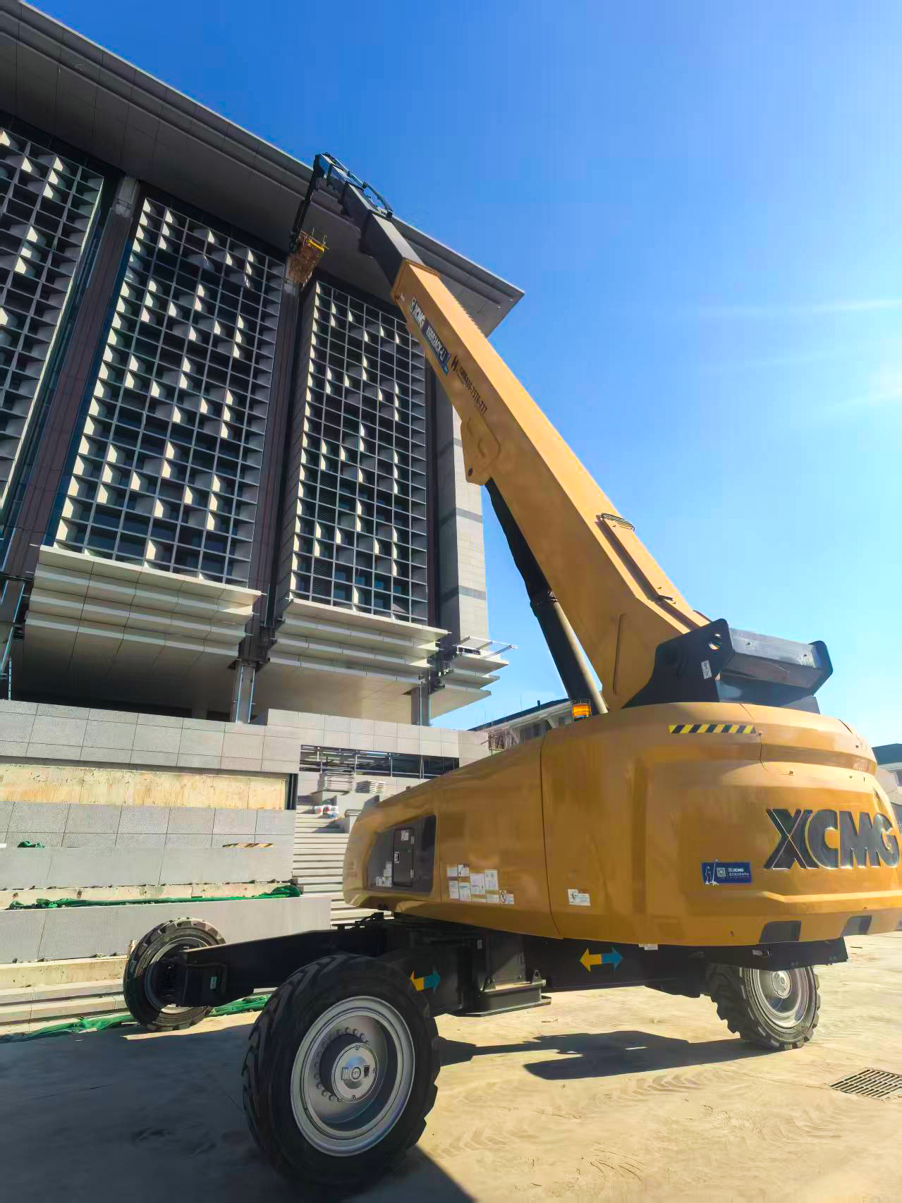 徐工XGS52ACK-Li憑借五節(jié)直臂+二節(jié)曲臂復(fù)合結(jié)構(gòu),施工時作業(yè)平臺距幕墻最近僅0.03米,實現(xiàn)“無腳手架化”精準就位。
