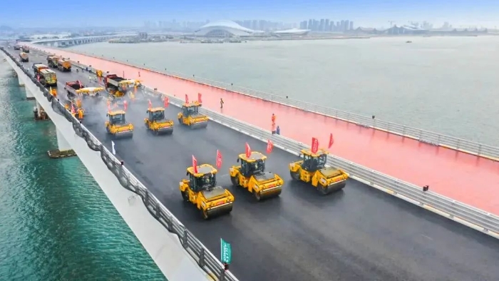 翔安大橋在建設中既要克服海上風浪大、潮差高、巖層強度高、跨越生態(tài)保護區(qū)等困難,又要兼顧綠色環(huán)保;要在這種復雜的環(huán)境中保證施工質量,對設備和施工技術的選擇就顯得尤為重要。徐工數字化智能施工集群憑借其智能化、高精度、高效率等顯著優(yōu)勢,成功克服了傳統施工方式難以應對的諸多難題,可精準適配翔安大橋的橋面鋪裝工作。