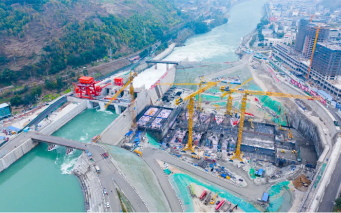 該水電站位于四川省樂山市金口河區(qū)境內(nèi),是四川省“十四五”重點建設(shè)項目,項目完成后,總裝機容量30萬千瓦,預(yù)計年平均發(fā)電量15.03億千瓦時,對促進國家清潔能源基地建設(shè)、實現(xiàn)“雙碳”目標意義重大。項目主要設(shè)有五孔泄洪閘、發(fā)電廠房、兩岸混凝土重力壩、魚道等水工建筑物,壩體最高54米。