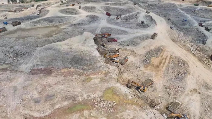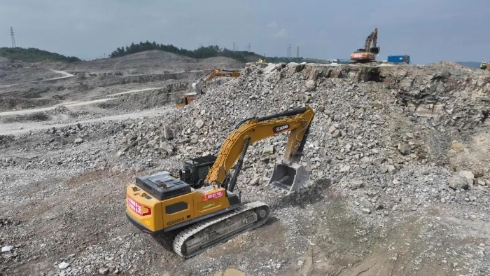 前期爆破剝離工序后,徐工20噸挖掘機(jī)搭配140的小破碎錘進(jìn)行二破,同時XE380GK、XE600GK等機(jī)型進(jìn)行挖裝作業(yè)。現(xiàn)場共投入挖掘機(jī)50多臺,每天的挖方量在10萬方左右。