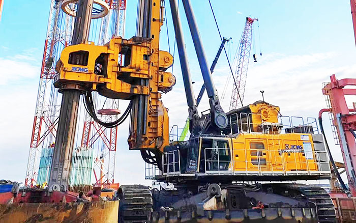 徐工XR1600E旋挖鉆機(jī)參建項(xiàng)目為世界上跨度最大的西堠門(mén)公鐵兩用跨海大橋,其中5號(hào)主塔墩基礎(chǔ)采用18根6.3m鉆孔灌注樁進(jìn)行承載。XR1600E旋挖鉆機(jī)需要在大風(fēng)、激流、裸巖、深水的復(fù)雜海洋環(huán)境下為這座超級(jí)跨海大橋進(jìn)行夯基,完成目前國(guó)內(nèi)最大直徑6.3m的鉆孔施工!