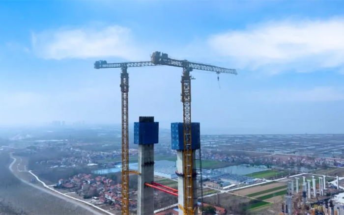 大橋主墩建設(shè)是整座大橋順利完工的“壓艙石”,大橋北主塔高度211.75米,采用主塔鋼筋部品整體吊裝。作為徐工超大塔中的明星產(chǎn)品,兩臺(tái)徐工XGT2230A-100S扛起大橋北主塔的施工重任。
