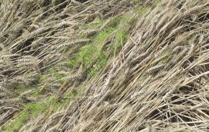 倒伏在地里的小麥來(lái)不及收割,開(kāi)始發(fā)芽