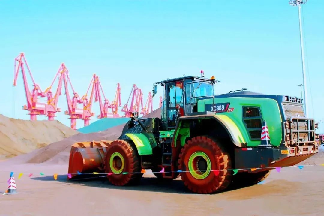 此次使用的純電動裝載機型號為徐工XC988-EV,額定載重8500kg,額定功率590kW,最大掘起力240kN。大鉸接、大開檔、礦山級車架結構件設計,采用CAE仿真分析、機器人焊接等智能設計制造手段,滿足各種超重載工況作業(yè)要求,與港口散貨作業(yè)需求十分貼合。