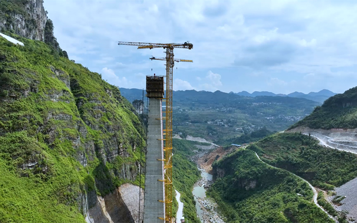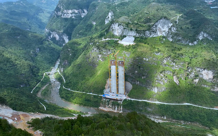 金旗特大橋是世界上目前在建最高的深山峽谷連體斜拉橋,主塔總高度達(dá)300.5米,施工區(qū)域多喀斯特地貌,地下巖層脆弱、兩岸山體陡峭、施工區(qū)域狹窄、轉(zhuǎn)運(yùn)困難,其長(zhǎng)度、塔柱高度、施工區(qū)域地形地貌均為國(guó)內(nèi)罕見的高難度。