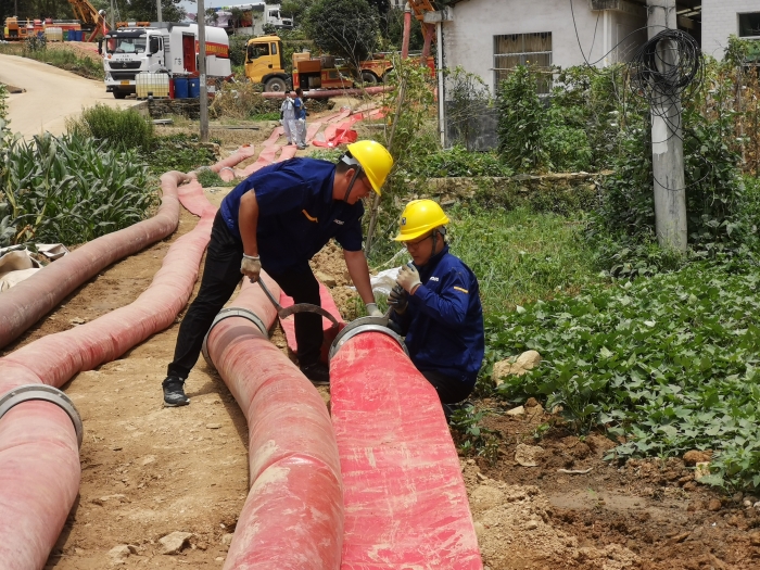 面對(duì)嚴(yán)峻的救援形勢(shì),7月12日到達(dá)現(xiàn)場(chǎng)后,救援隊(duì)伍便緊鑼密鼓開始整備,商議排水方案、調(diào)試車輛、鋪設(shè)水帶、檢查管路……為搶抓救援時(shí)間,在制定了嚴(yán)謹(jǐn)細(xì)致的排水方案后,現(xiàn)場(chǎng)采用“兩班倒”的方式,在近40℃的高溫下24小時(shí)不停機(jī)作業(yè)。