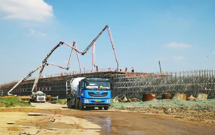 驕陽灼灼,機(jī)械轟鳴。近日,在江蘇省重點(diǎn)交通建設(shè)工程-江陰靖江長江隧道建設(shè)現(xiàn)場,徐工泵車及純電動攪拌車多機(jī)合作,憑借先進(jìn)技術(shù)和優(yōu)越性能,圓滿完成橋面混凝土澆筑任務(wù)。