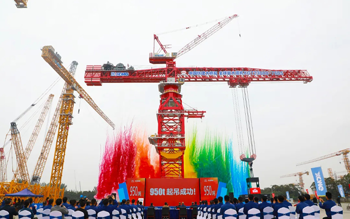 儀式現(xiàn)場(chǎng),全球最大塔機(jī)XGT23000-760S順利完成1.25倍動(dòng)載起吊,吊裝重量達(dá)到950噸。