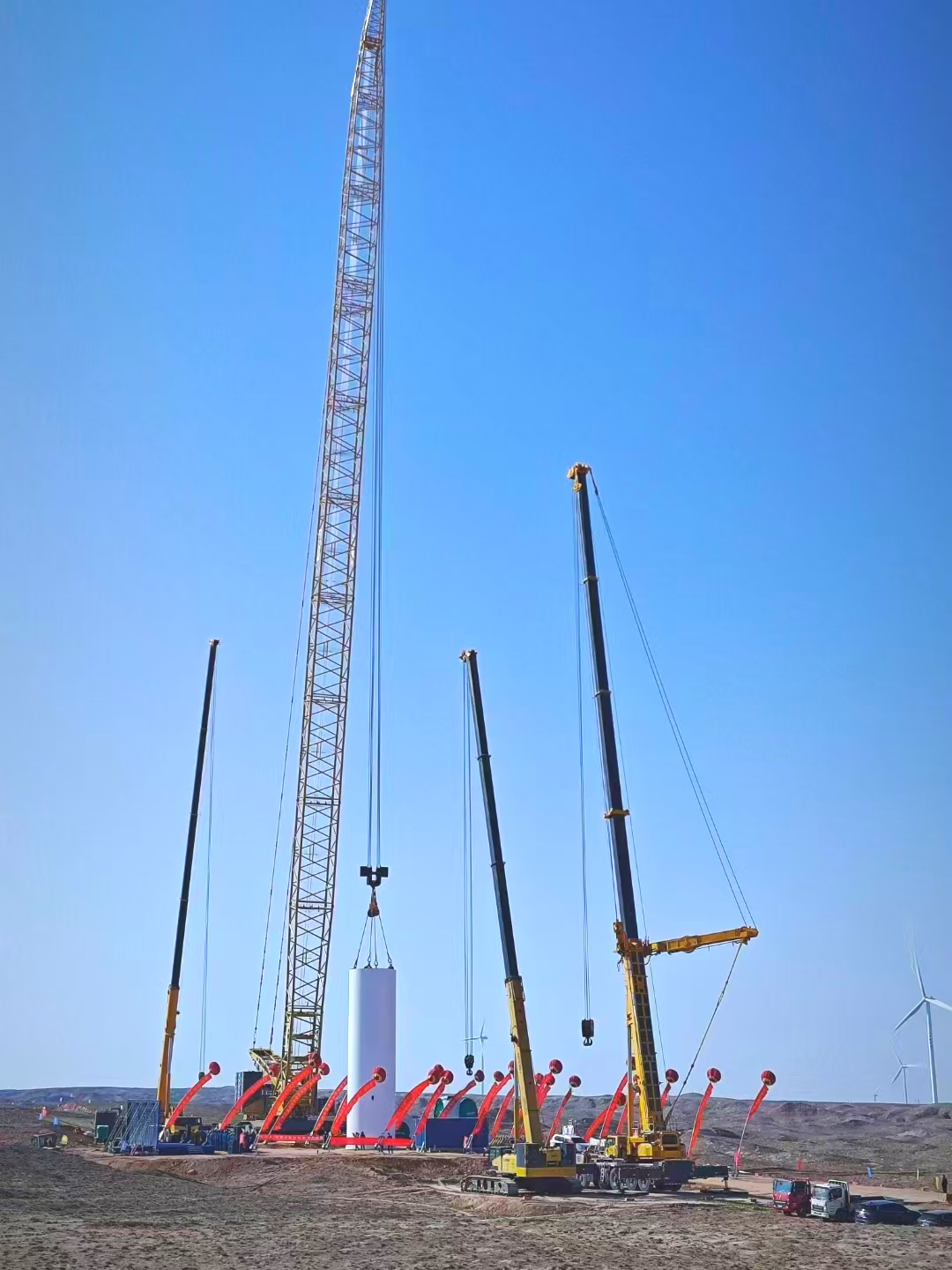 隨著施工號角吹響,各臺起重機緊密配合,XLC18000M采用138+8m的標準風電工況,穩(wěn)穩(wěn)將98m長的葉片與112t重的輪轂、葉片在百米高空精確連接到機艙,XGTC160-I、XCA600L8 和 XCA200L8_2則靈活調整位置,輔助完成關鍵部件的吊裝,整個吊裝過程精確無誤。