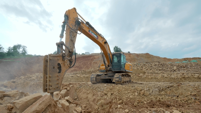 該設(shè)備搭載的低速大扭矩發(fā)動機與大排量主泵協(xié)同發(fā)力,15100J的超大沖擊力輕松解體圍巖巨石,破碎后的骨料直接用于站區(qū)圍擋澆筑填充,實現(xiàn)資源閉環(huán)利用。