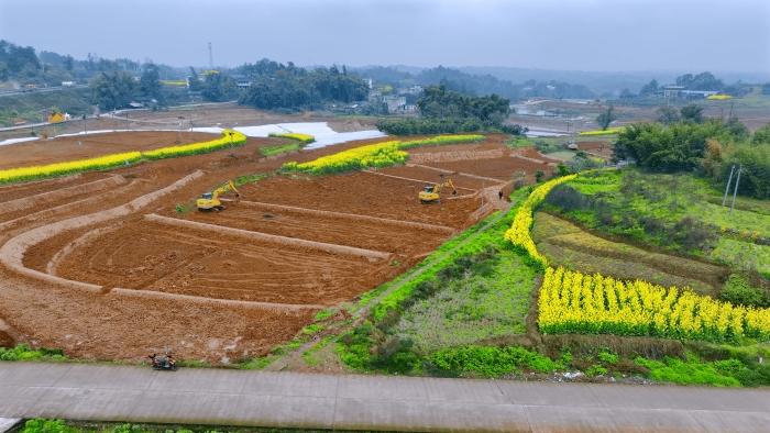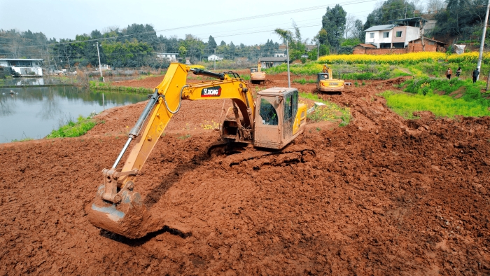 洪雅向東90公里,是仁壽縣,作為四川省產(chǎn)糧大縣,仁壽曾因田塊細碎導致機械化率不足。在5000畝的高標準農(nóng)田建設中,項目方集結18臺徐工挖掘機,以“日均30多畝”的速度搶抓工期。