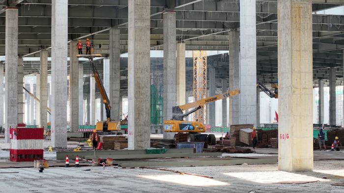 據(jù)悉,該廠房建筑面積達(dá)80萬平方米,相當(dāng)于三個鳥巢體量,也是目前長三角地區(qū)泛半導(dǎo)體行業(yè)單體最大的廠房。該廠房雖然建筑面積極大,但作為LED生產(chǎn)廠房,廠房的潔凈度要求非常高,因此,廠房地面布置了均勻分布、大小一致的回風(fēng)孔,也就是常說的“華夫板”。為了保護(hù)華夫板地面涂層并分散荷載,保障施工安全,施工設(shè)備不能直接在華夫板上行駛,只能依托臨時鋪設(shè)的厚鋼板通行、作業(yè),這無疑是對產(chǎn)品的穩(wěn)定性、輕量化提出了考驗。