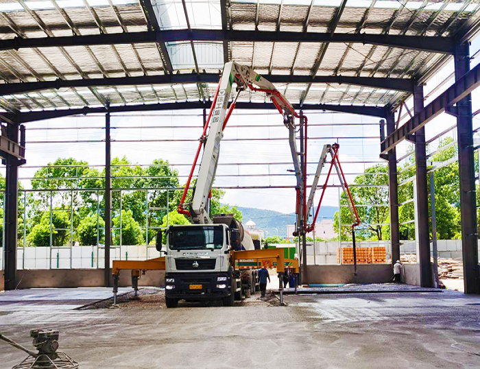 徐工HB37V泵車在宜興某廠房建設(shè)中,以“鋼鐵脊梁”之姿擔(dān)綱底板大體積澆筑重任。