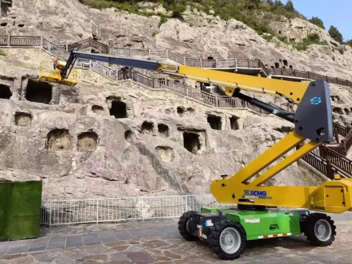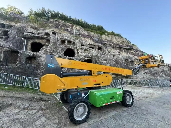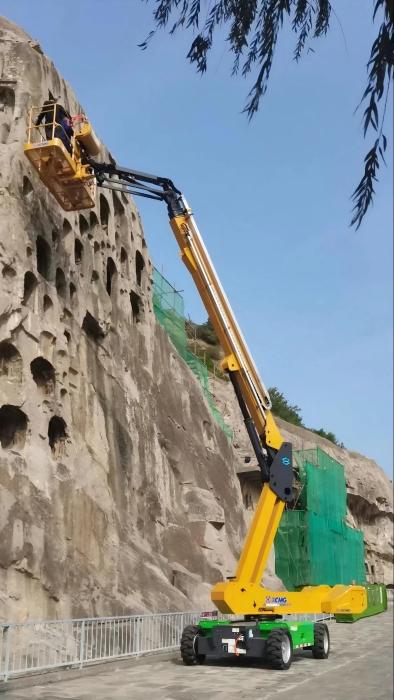 時間回溯到2021年,由于遭受多場暴雨侵襲,龍門石窟部分洞窟內(nèi)滲漏水嚴(yán)重甚至出現(xiàn)積水,部分山體表面巖石脫落、松動,嚴(yán)重威脅文物安全,急需得到有效治理。龍門石窟研究院隨即開展了為期1年多的“龍門石窟蓮花洞至石牛溪區(qū)域保養(yǎng)維護(hù)項(xiàng)目”。徐工XGS25ACK-Li直臂式高空作業(yè)平臺作為“得力助手”,深度參與各項(xiàng)保護(hù)修復(fù)工作。