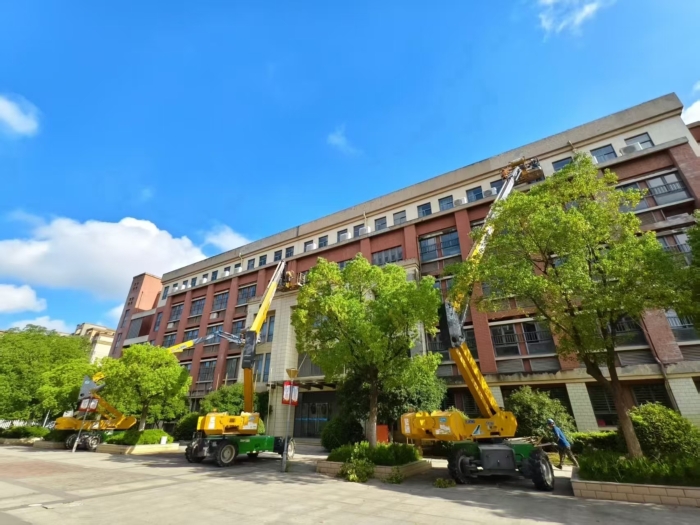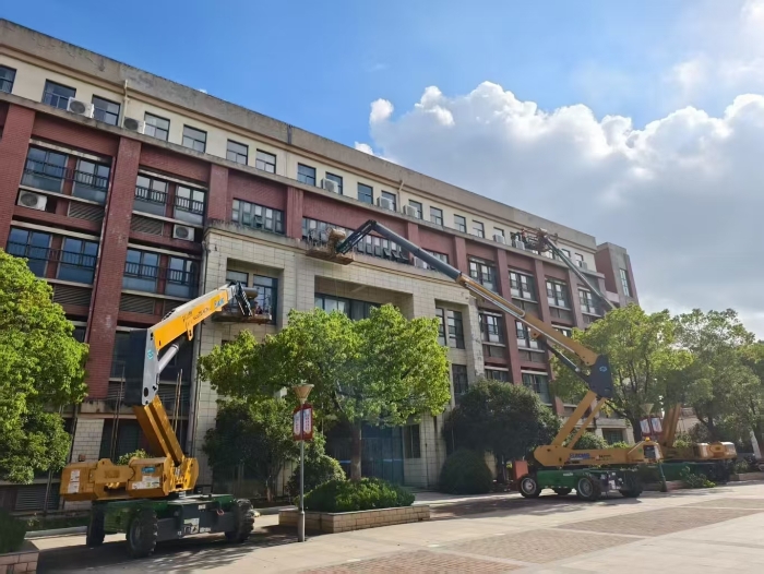 此次施工通過使用徐工高空作業(yè)設(shè)備,有效避免了傳統(tǒng)腳手架對校園場地占用大、搭設(shè)周期長的影響,體現(xiàn)了現(xiàn)代化施工設(shè)備在校園維修改造中的顯著優(yōu)勢。