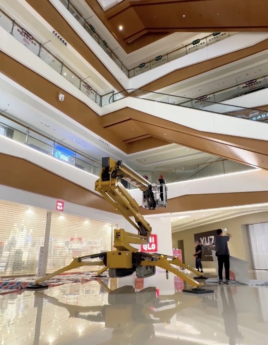 在杭州某大型商場,徐工XGS26X-Li將四只“蜘蛛腿”穩(wěn)穩(wěn)“扎根”在商場中庭,正在向玻璃圍欄下方的墻壁伸展臂架。超窄車身“溜”進商場、伸縮臂架“瞄”準(zhǔn)墻面,這是徐工蜘蛛車在商場進行維修保養(yǎng)的日常。而看似日常的施工,需要面對三關(guān)“難題”。