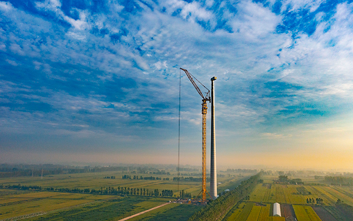 郯城風(fēng)場此次吊裝的風(fēng)機創(chuàng)下區(qū)域高度紀錄,采用140米混塔+45 米鋼塔結(jié)構(gòu),葉輪直徑達 220 米,僅機艙與葉輪總重就超 200 噸。185 米的高空作業(yè),風(fēng)力擾動、部件對接精度等因素對吊裝設(shè)備的性能提出了極致考驗,毫厘之差便可能影響整座風(fēng)場的并網(wǎng)進度。