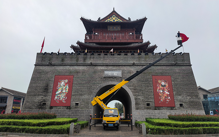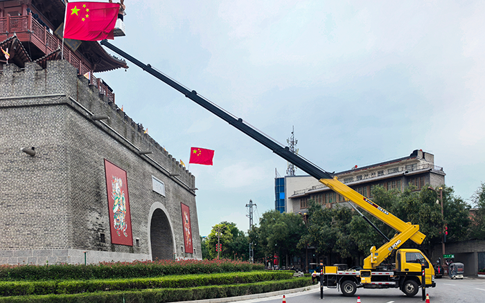 文昌閣前,一抹抹 “中國(guó)紅” 悄然升起。徐工 M 系列 GKS32 高空作業(yè)車伸展長(zhǎng)臂,穩(wěn)穩(wěn)將施工人員送達(dá)高空作業(yè)點(diǎn)。最大作業(yè)高度32 米,精準(zhǔn)覆蓋建筑立面,轉(zhuǎn)臺(tái) 360° 連續(xù)回轉(zhuǎn)間,國(guó)旗已平穩(wěn)就位。