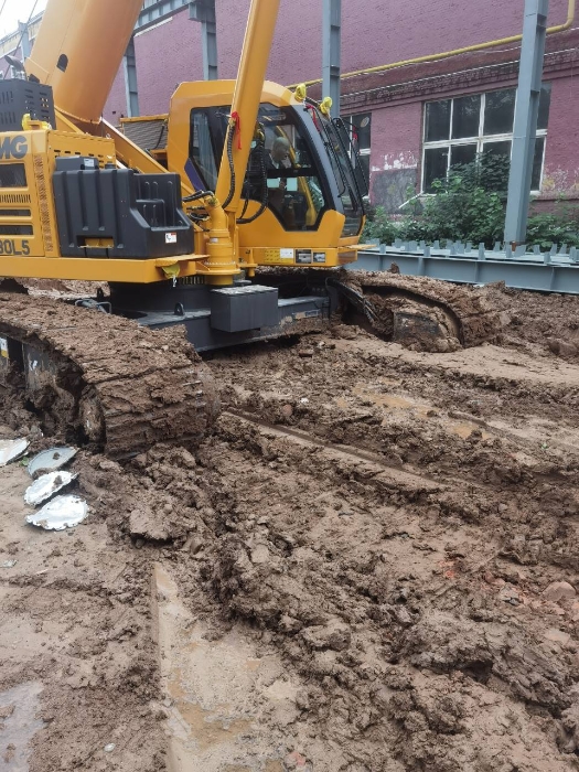 在絕大多數(shù)設(shè)備望而卻步的深水泥濘場地上,一座鋼結(jié)構(gòu)的廠房正拔地而起。這背后,徐工XGTC30L5(30噸級(jí))伸縮臂履帶起重機(jī),正以卓越的性能,將施工困境變?yōu)檎蔑@實(shí)力的舞臺(tái)。