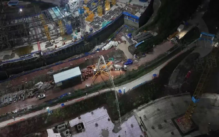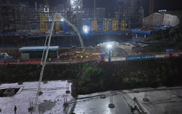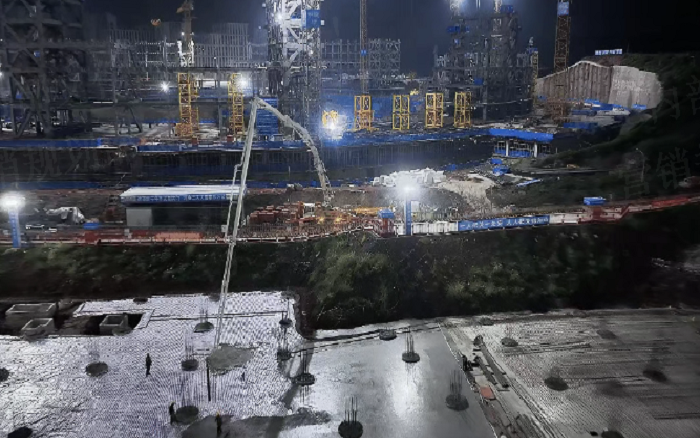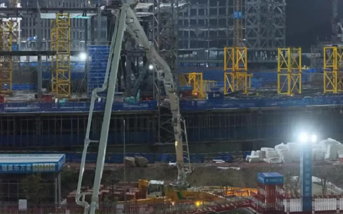 凌晨三點(diǎn)的重慶兩江新區(qū),徐工72米泵車展臂高空,20輛新能源攪拌車穿梭往來—這不是科幻電影場景,而是徐工混凝土成套化裝備助建重慶賽力斯全球汽車公園的火熱夜戰(zhàn)場面。