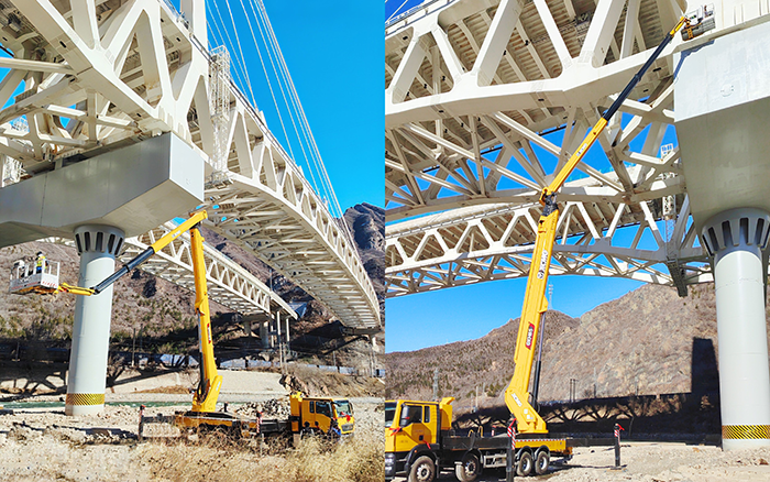 徐工 GKH65 高空作業(yè)車憑借強(qiáng)悍跨障能力,在這座關(guān)鍵橋梁的側(cè)面管路安裝施工中,盡顯硬核實(shí)力,為橋梁運(yùn)維領(lǐng)域樹立全新技術(shù)標(biāo)桿。