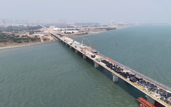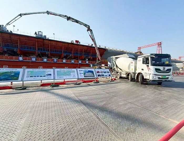 歷時五小時連續(xù)作業(yè),1200立方米混凝土在橋面和橋梁關(guān)鍵部位凝固成型,為這座連接兩岸的“海上飛虹”增添了新的筋骨。