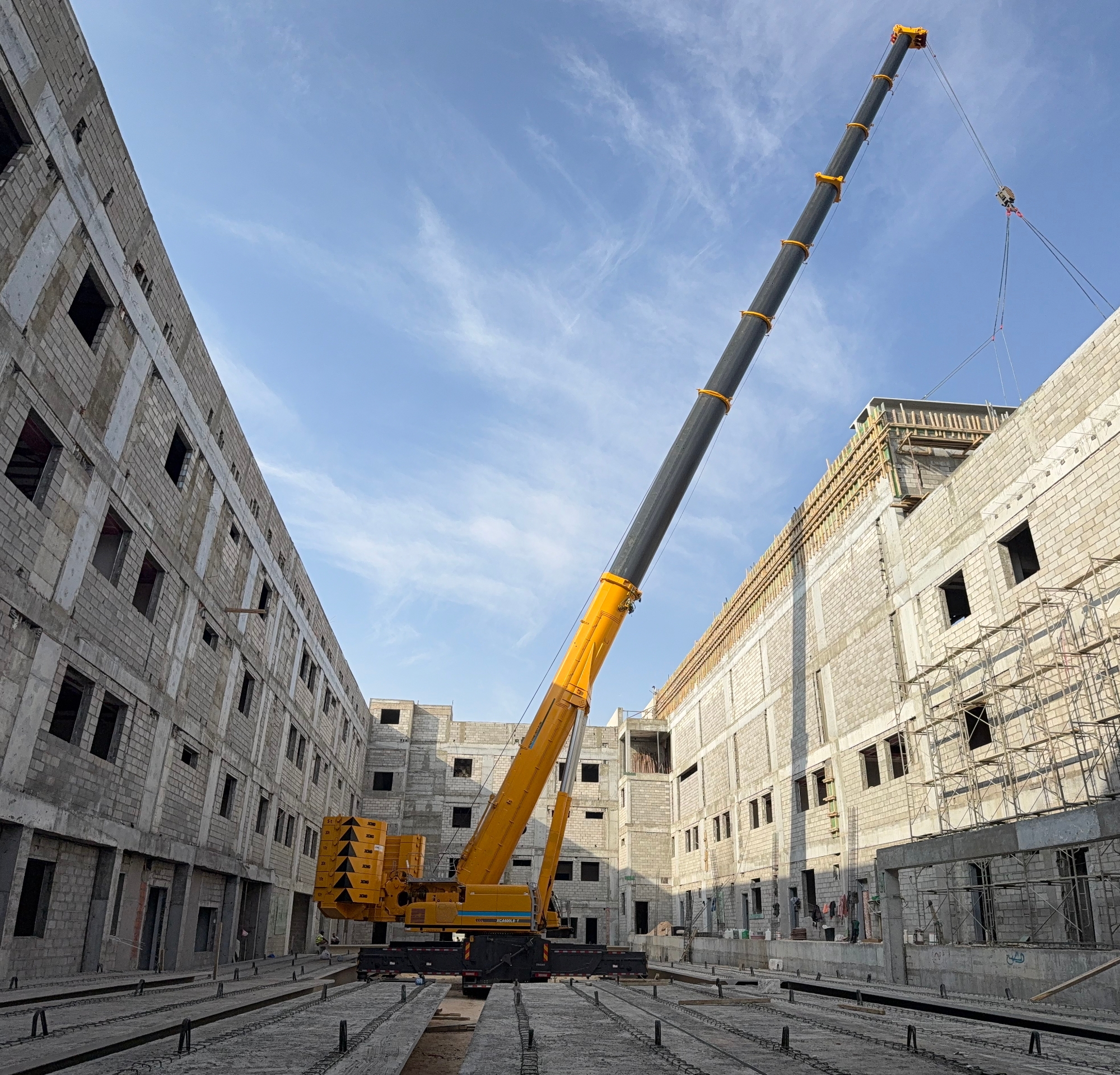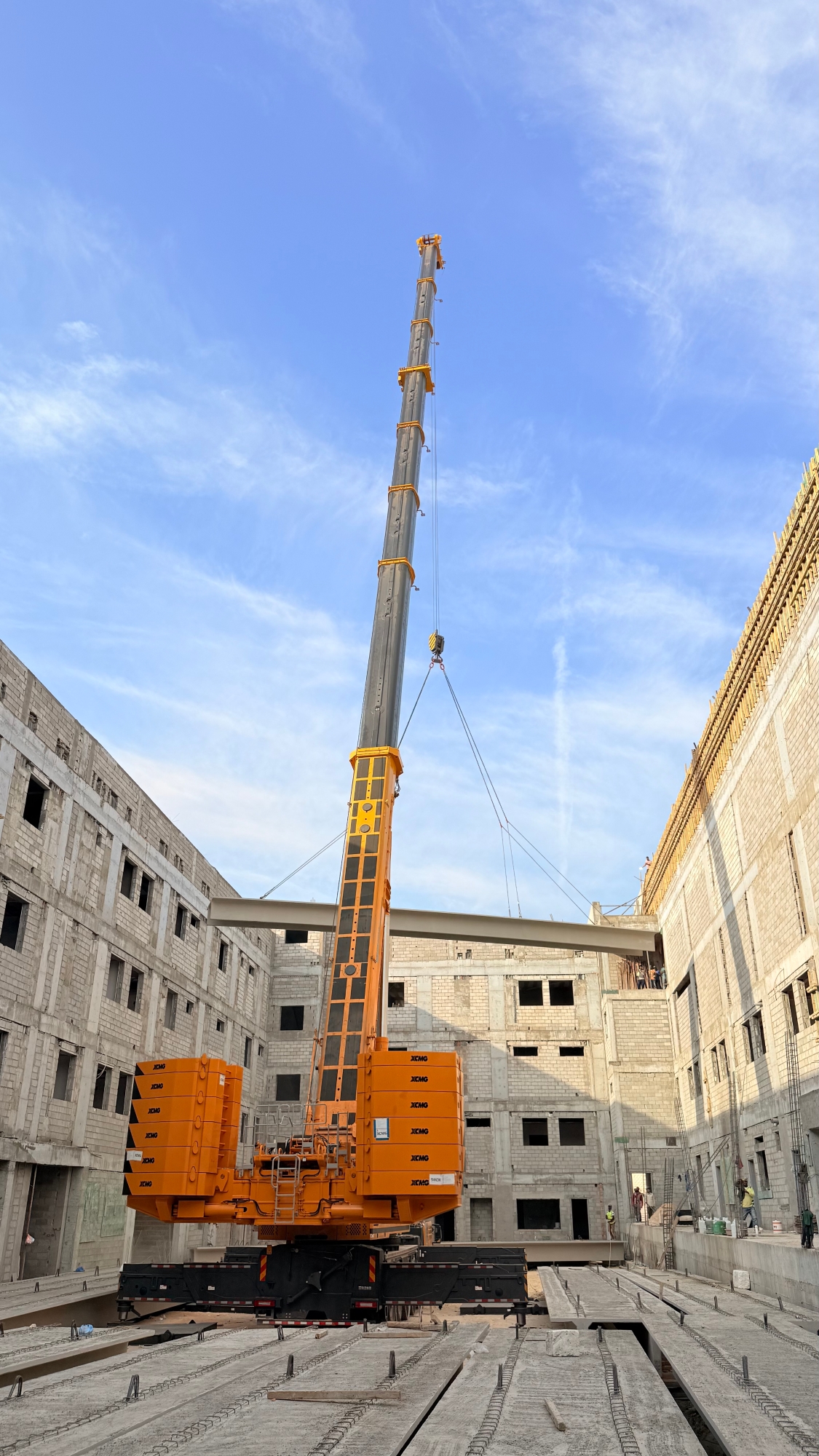 此次施工位于沙特快速發(fā)展的都市區(qū)域,項(xiàng)目本身對(duì)工期與精度有著嚴(yán)苛要求。高層建筑的樓板吊裝,尤其是對(duì)于重量超過(guò)十噸的大型預(yù)制構(gòu)件,不僅是對(duì)起重機(jī)極限載荷能力的考驗(yàn),更涉及在復(fù)雜城市空間中的微動(dòng)操作、抗風(fēng)穩(wěn)定及高空精準(zhǔn)就位等一系列高技術(shù)要求。現(xiàn)場(chǎng)空間有限,周邊環(huán)境復(fù)雜,對(duì)設(shè)備的機(jī)動(dòng)性、站位適應(yīng)性以及操控的精細(xì)度提出了全方位挑戰(zhàn)。