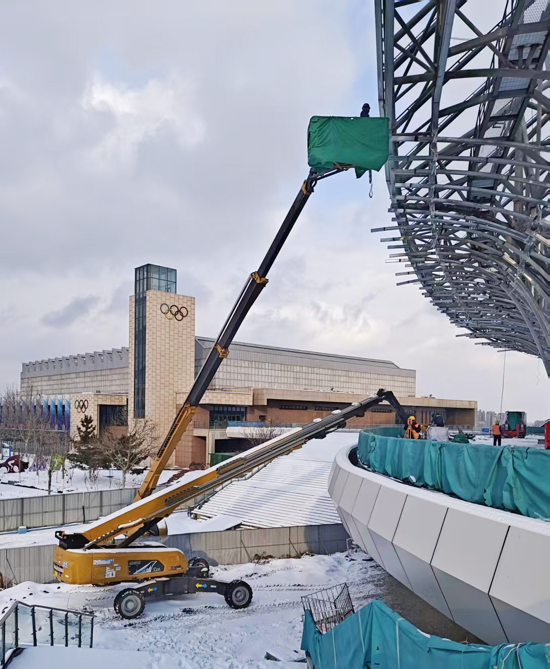近日,全國多地氣溫驟降,城市迎來普遍降雪。位于山東煙臺的蓬萊體育館建設(shè)項目正面臨冬季雪天施工的嚴(yán)苛考驗,為保障施工進度,XGS30K、XGS40K、XGS45K、XGS58K等16臺徐工高米數(shù)柴動直臂高空作業(yè)平臺,組成“高空攻堅隊”頂雪作業(yè)。