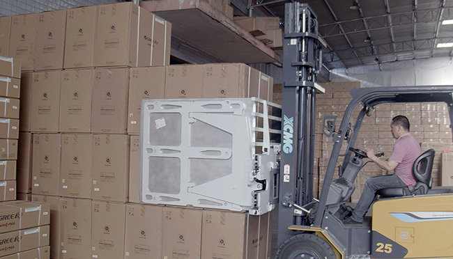 空調(diào)等家電單品價(jià)值高,鯤鵬電動(dòng)叉車配備OPS安全防護(hù)系統(tǒng)、轉(zhuǎn)彎降速等功能,屬具方面專門為客戶定制了紙箱夾,高支點(diǎn)轉(zhuǎn)向橋,減小轉(zhuǎn)彎時(shí)車身擺動(dòng)幅度,進(jìn)一步確保貨物和人員安全。