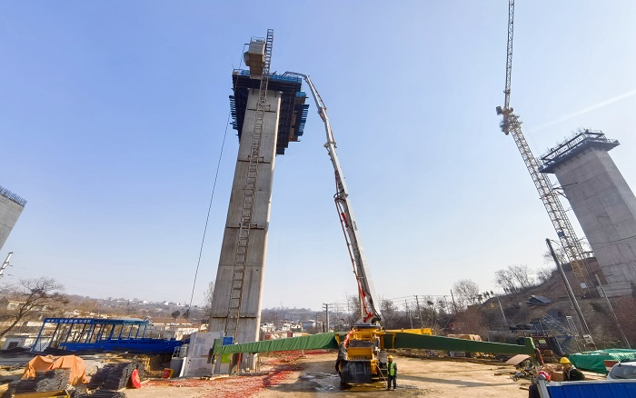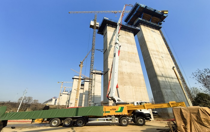 65米高空,72米長(zhǎng)臂——在河南焦平高速施工現(xiàn)場(chǎng),徐工72米泵車(chē)以“空中搭橋”之勢(shì)攀越橋墩,穩(wěn)穩(wěn)輸送。