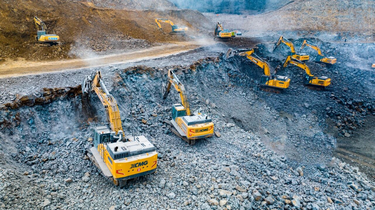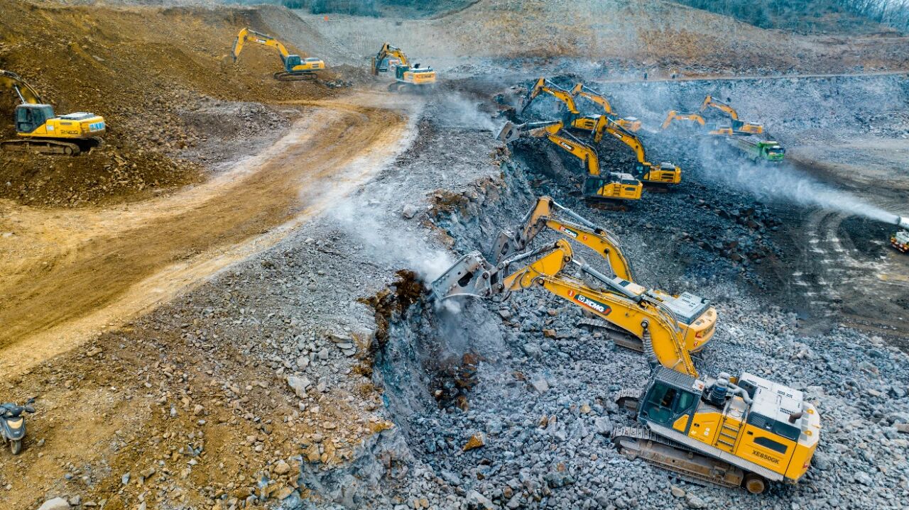 為確保工程順利推進(jìn)、搶抓冬季施工黃金期,施工方經(jīng)過多次研討優(yōu)化施工方案,最終選定徐工挖掘機(jī)承擔(dān)本次場平核心任務(wù)。目前,現(xiàn)場已陸續(xù)進(jìn)駐14臺徐工挖掘機(jī),全面包攬山體玄武巖破碎及土石料裝車等關(guān)鍵工序,全力攻堅約300萬方的工程總量。據(jù)悉,滁州部分施工區(qū)域地質(zhì)條件復(fù)雜,多為堅硬玄武巖,對施工設(shè)備的效率與可靠性提出極高要求,而徐工XE650GK等明星機(jī)型憑借出色性能成為攻堅主力。其中8臺XE650GK搭配215破碎錘,依托獨有的破碎多級調(diào)頻控制技術(shù),高效破解高硬度巖石施工難題,每日保底破碎玄武巖1500噸以上,輕料作業(yè)日產(chǎn)量可達(dá)2000至3000噸,且油耗控制在40L左右,實現(xiàn)高效與節(jié)能雙贏;徐工380、335等機(jī)型則協(xié)同開展土石方挖裝作業(yè),搭配礦山專用鏟斗,以靈活操作、穩(wěn)定底盤和優(yōu)異的挖裝效率,成為施工現(xiàn)場的“得力干將”。