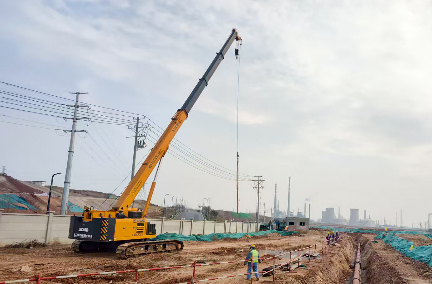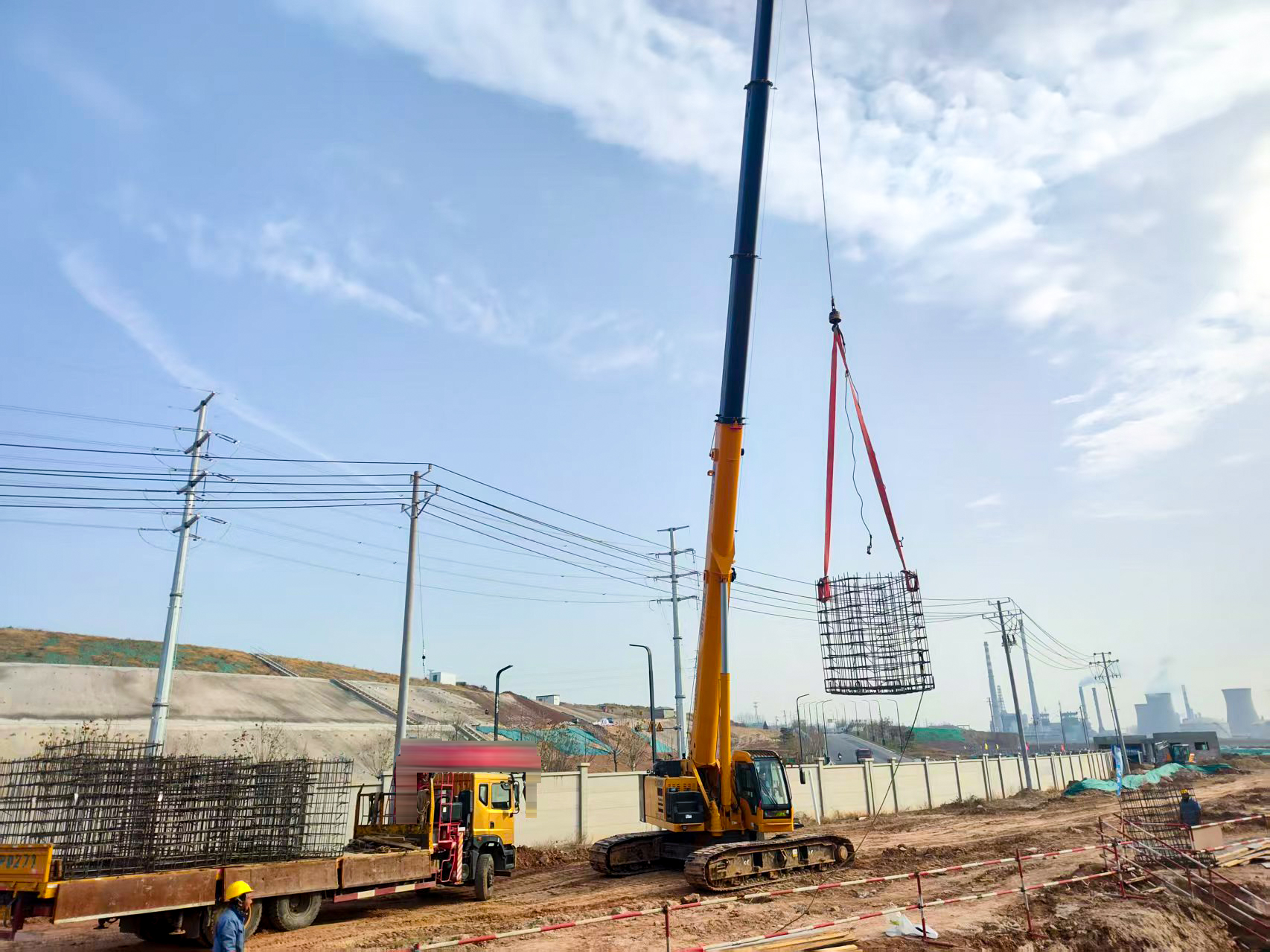 洛陽(yáng)百萬噸聚乙烯項(xiàng)目基礎(chǔ)施工現(xiàn)場(chǎng),XGTC30L5(30噸級(jí))伸縮臂履帶起重機(jī)正承擔(dān)著關(guān)鍵工序——鋼筋籠吊裝。