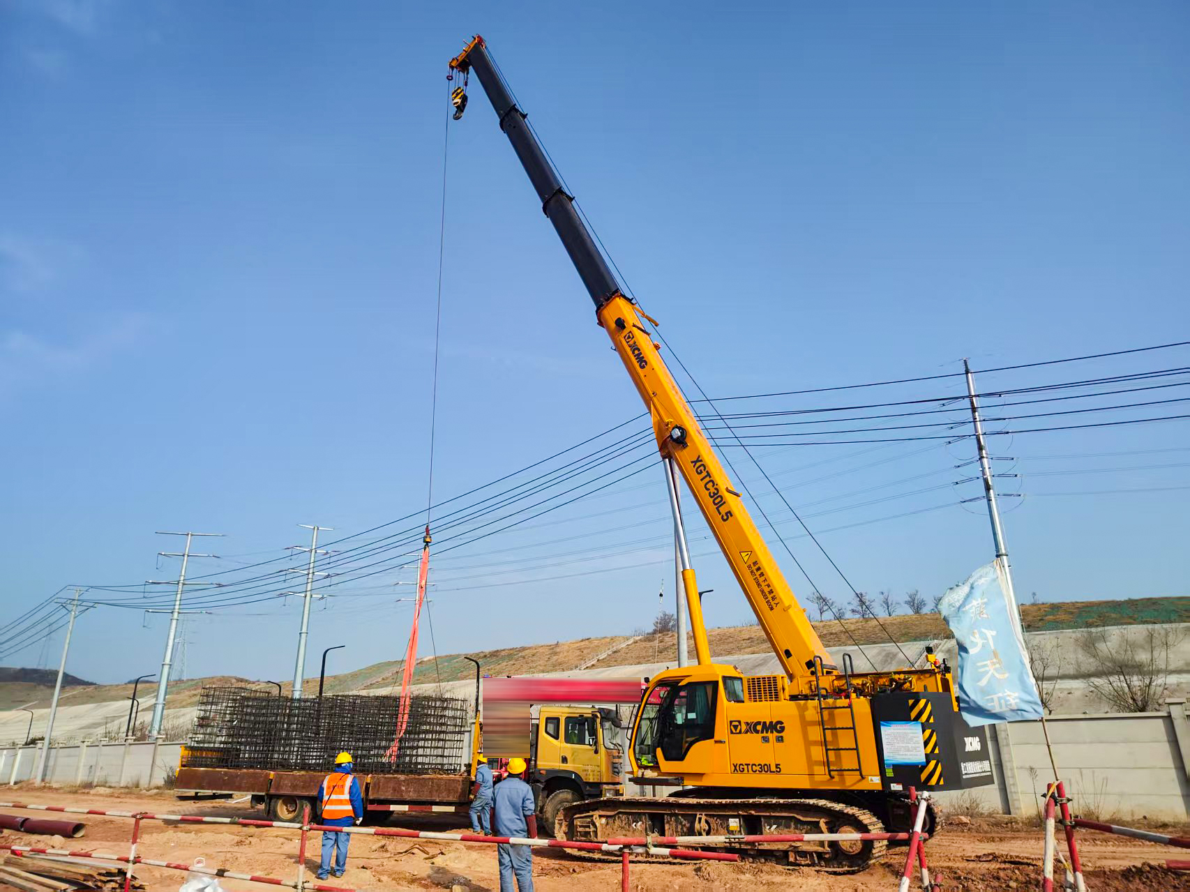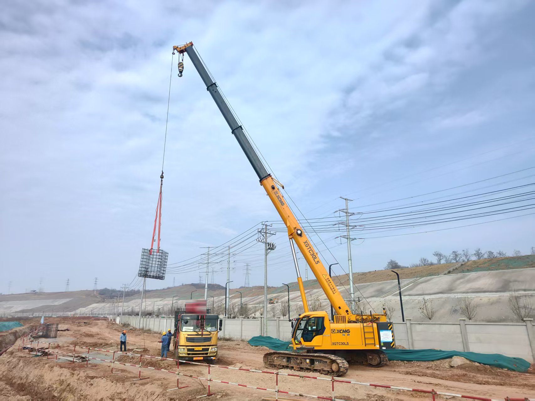 在34.2米主臂、15米幅度工況下,XGTC30L5將單個(gè)5噸重的鋼筋籠,從運(yùn)輸車輛上起,精準(zhǔn)植入預(yù)定樁孔,一氣呵成。
