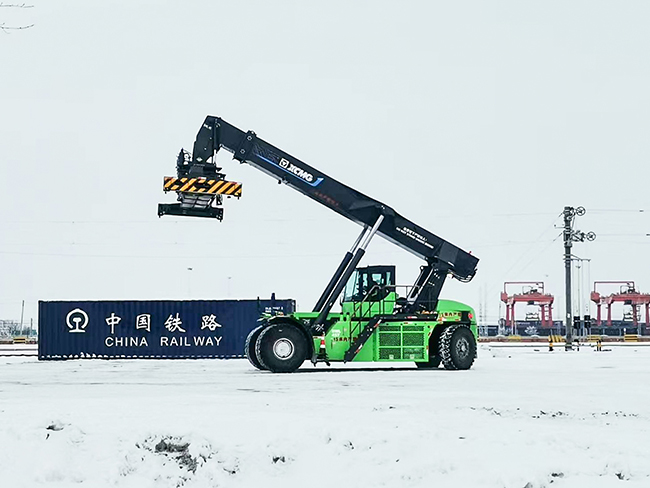 徐工純電動正面吊創(chuàng)新應(yīng)用全域智能溫控平臺,通過電池包智能檢測與液壓系統(tǒng)低溫自適應(yīng)策略,即使在-40℃以下的嚴(yán)寒環(huán)境中,仍能保持動力系統(tǒng)高效輸出。