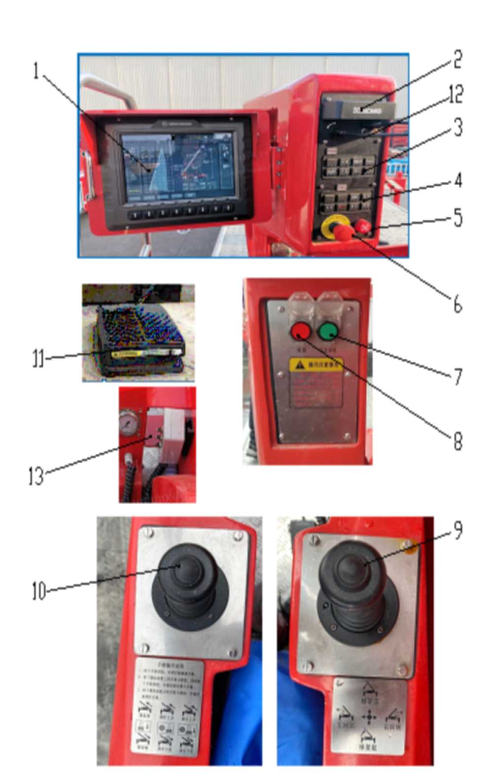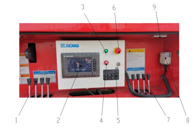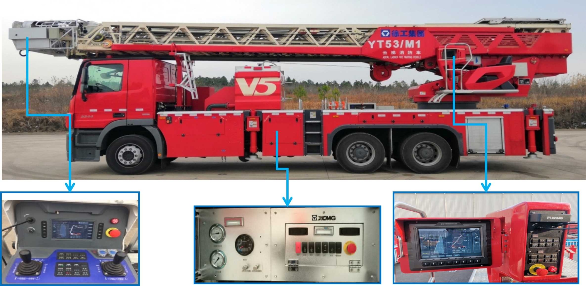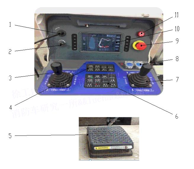 車輛動(dòng)作操作系統(tǒng),分布于下車后尾、下車左前消防操作處、轉(zhuǎn)臺(tái)操作處、平臺(tái)操作處;部分車輛配備遠(yuǎn)程遙控箱。包括顯示器、操作手柄、橡膠按鍵、翹板開關(guān)、鈕子開關(guān)、按鈕開關(guān)、指示燈等。